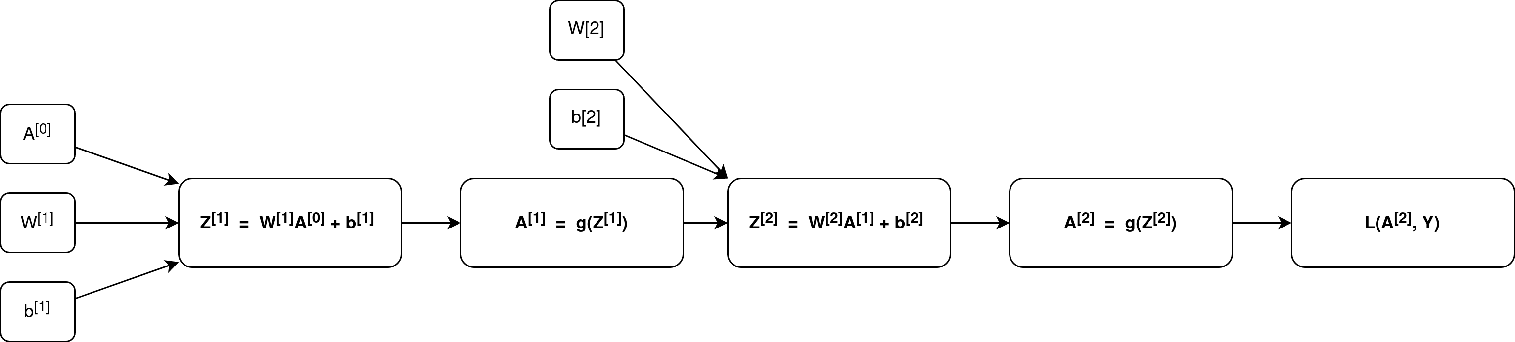 \[J(W,b) = (1/m)\sum_{i=1}^{m}{L(A, Y)}\]For backward propagation, we need to calculate \(\frac{\partial L}{\partial W^{[2]}}\), \(\frac{\partial L}{\partial b^{[2]}}\), \(\frac{\partial L}{\partial W^{[1]}}\) and \(\frac{\partial L}{\partial b^{[1]}}\) where we update